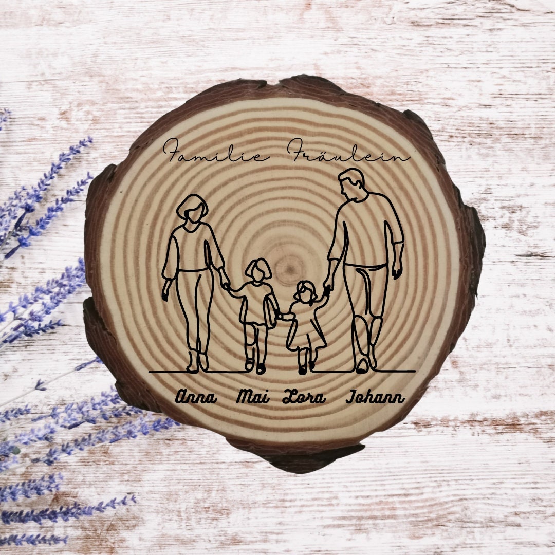 Personalisierte Naturholzscheibe für Familien, als einzigartige Deko oder als Hausschild, für Mama, Papa, Oma, aus Kiefernholz